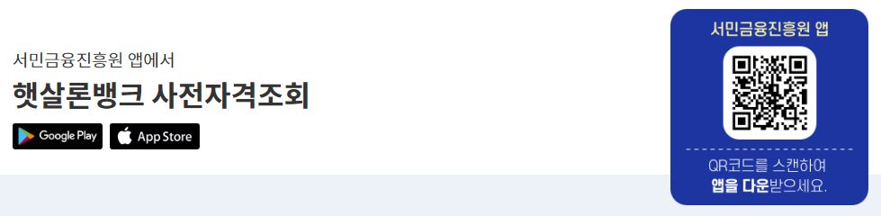 ※ (사전조회) 대출신청 전 서민금융진흥원 App을 통해 자격대상 여부를 조회 후 은행을 방문하시면 보다 편리하게 이용하실 수 있습니다.